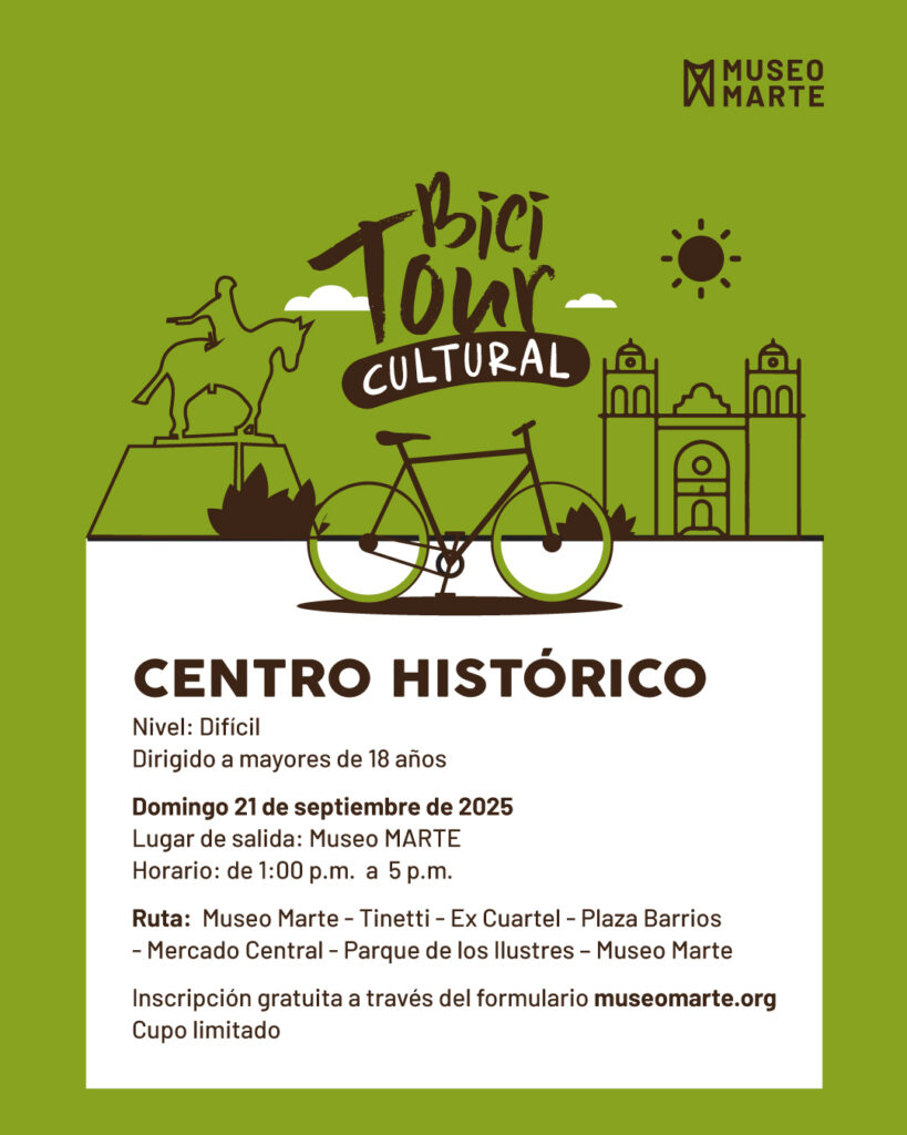 Únete en el IV Bicitour Cultural que te propone el Museo MARTE. En esta ocasión visitamos el Centro Histórico de San Salvador, para descubrir las conexiones entre la historia, la memoria y nuestro presente. Además, recorreremos de cerca las calles y espacios de inspiración para la exposición «ATRÓFICA» del artista Óscar López.