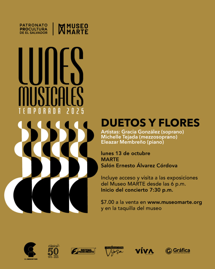 El programa de Lunes Musicales es posible gracias al apoyo de C. Imberton, Fundación Vijosa y Sistema Fedecrédito. Colaboran: Viva Outdoors, Radio Clásica y Gráfica. Organizan: Patronato Pro cultura de El Salvador y Museo Marte.