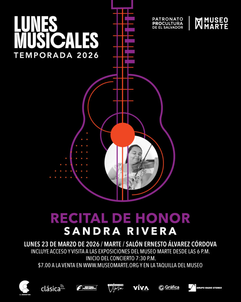 El lunes 23 de marzo de 2026, a las 7:30 p.m. el Museo MARTE será escenario del Recital de Honor del Estudio de Violín de Sandra Rivera, como parte del ciclo Lunes Musicales, una de las propuestas culturales permanentes del museo. La velada reunirá a jóvenes intérpretes destacados del Estudio de Violín de Sandra Rivera, con la participación del pianista salvadoreño Eleazar Membreño, en un programa que recorre obras de Johann Sebastian Bach, Georg Friedrich Handel, Francesco Maria Veracini, Béla Bartók, Pablo Sarasate y Niccolò Paganini, además de música latinoamericana.