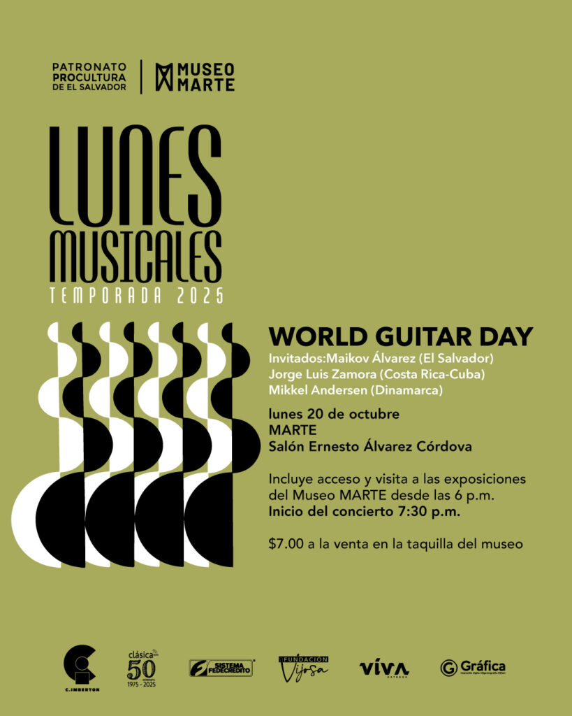 El programa de Lunes Musicales es posible gracias al apoyo de C. Imberton, Fundación Vijosa y Sistema Fedecrédito. Colaboran: Viva Outdoors, Radio Clásica y Gráfica. Organizan: Patronato Pro cultura de El Salvador y Museo Marte.